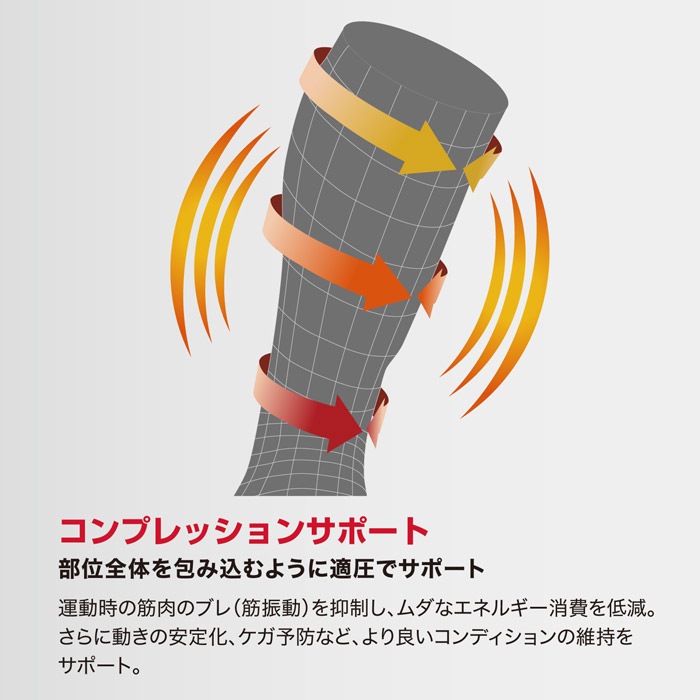 運動時の筋肉のブレ(筋振動)を抑制し、ムダなエネルギー消費を軽減。さらに動きの安定化、ケガの予防など、より良いコンディションの維持をサポート。
